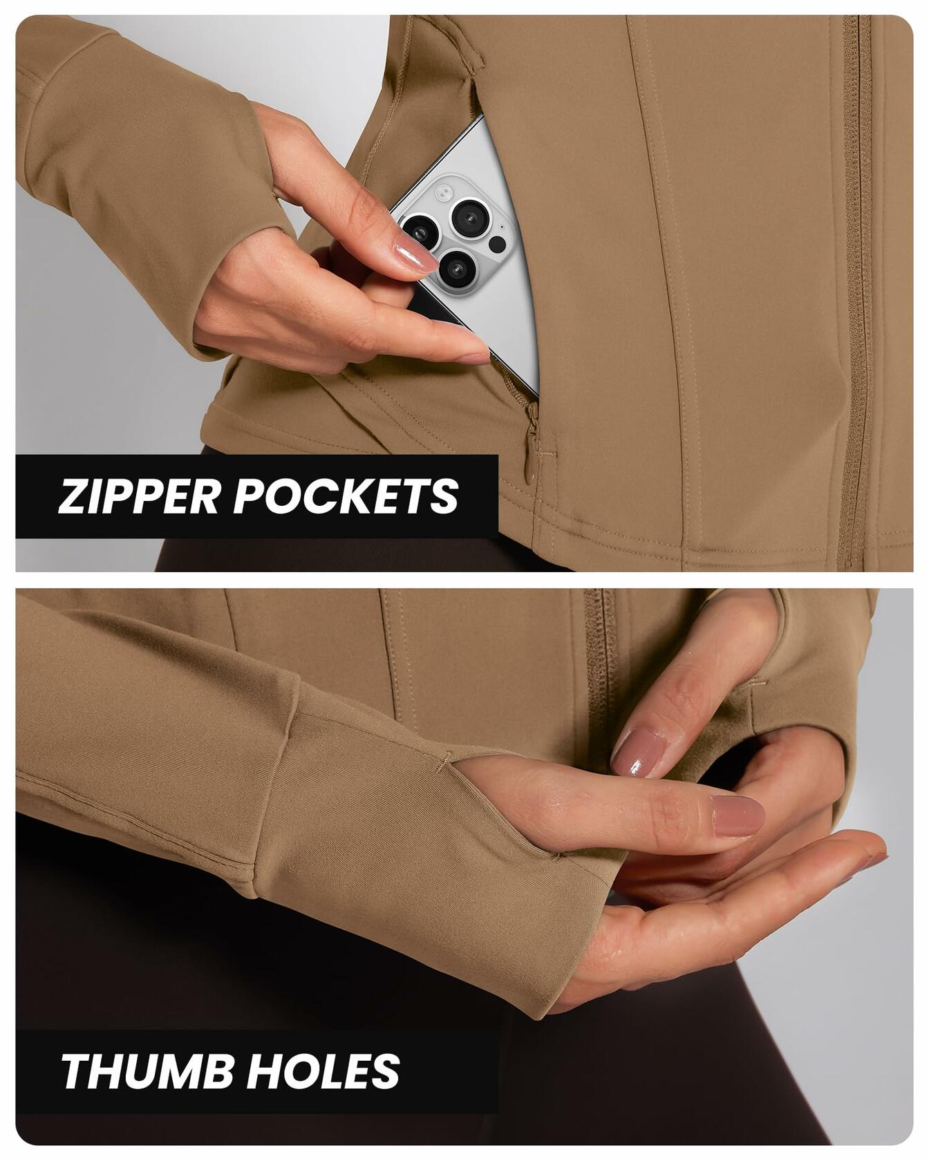 - Workout Jackets for Woman - Zip Pockets Design: The running jacket has two side pockets to store your phone or cards when you're on the go. There are also two interior pockets for other essentials
